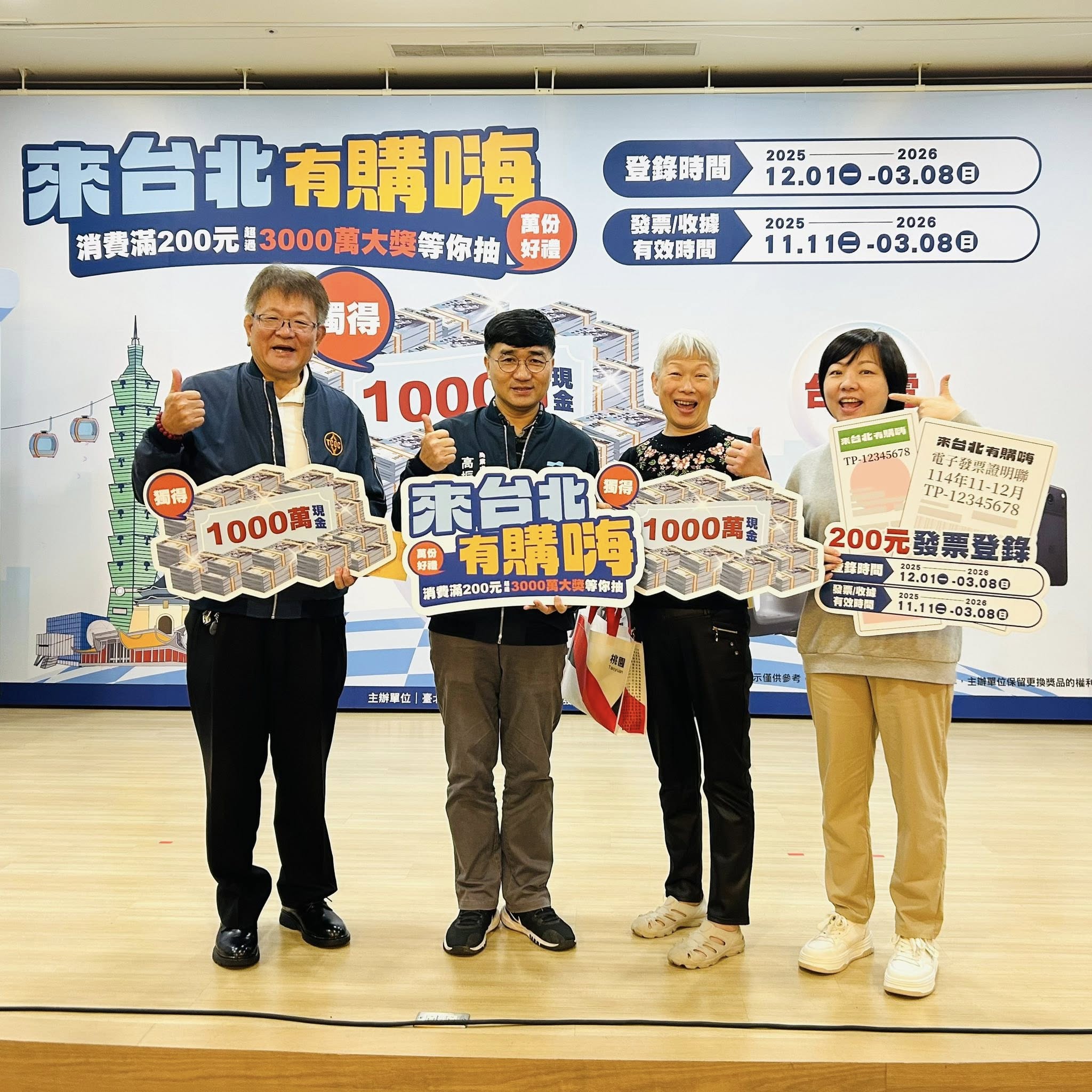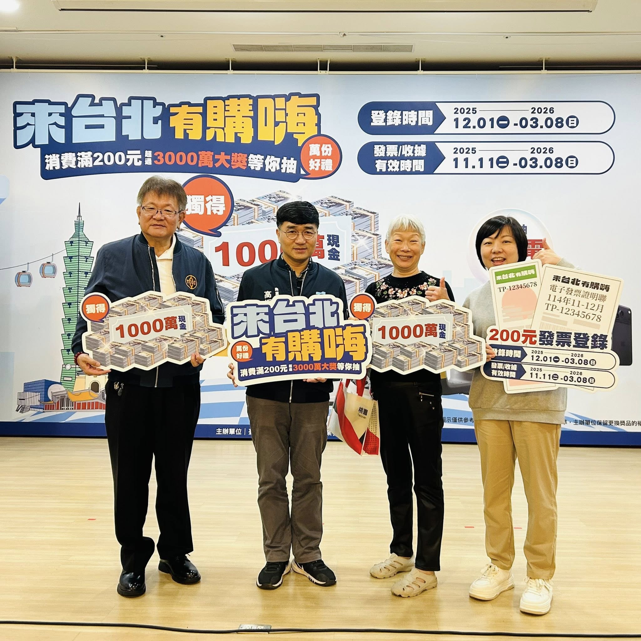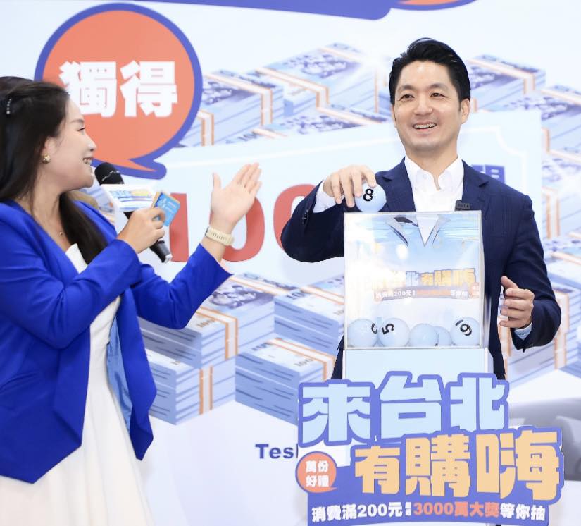 北市商業處為配合中央普發萬元政策,推出為期近4個月的「來台北有購嗨消費歡樂抽」抽獎活動,自114年11月11日起至115年3月8日,凡到台北市店家消費滿200元活動,即可獲得1組抽獎序號;活動祭出多項獎項,「周周抽」iPhone 17 Pro、「月月抽」台積電股票,活動最後的總抽獎是1000萬元現金大紅包、Tesla Model Y等大獎。
