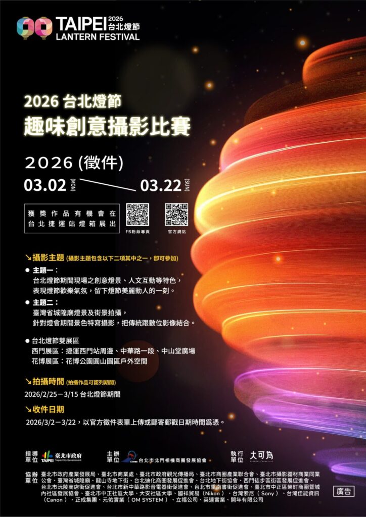 2026 臺北燈節趣味創意攝影比賽 來囉! 每年元宵,燈會都是城市最亮的一段時光。 今年,邀請你一起用鏡頭,留下屬於 2026 臺北燈節 的精彩瞬間 不論是創意燈景、熱鬧人潮, 還是街區裡那些不經意卻動人的畫面, 只要你覺得「這一刻值得被記住」,都歡迎投稿參賽。 拍攝期間|2/25–3/15 收件時間|3/2–3/22 器材不限・修圖不設限 多項攝影品牌好禮等你拿! 比賽報名:https://forms.gle/L1yLrqufwcXQ7PSbA 活動頁面:https://www.accupass.com/event/2601220936298649646430 #臺北燈節 #攝影比賽 #趣味創意攝影 來台北有購嗨,消費歡樂抽 2026 臺北燈節趣味創意攝影比賽
